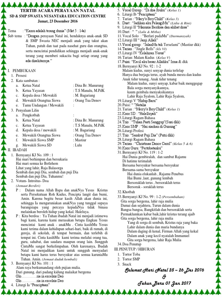 Tertib Acara Natal Sekolah Minggu / Tertib Acara Perayaan Natal Simanjuntak - S'lamat, s'lamat datang, yesus, tuhanku!. Kelompok penari (asm), iuduti 5 halak asm : Susunan barisan prosesi ai ma : Arahkanlah pandanganmu ke langit biru, lihatlah bulan dan bintang gemerlapan bagaikan. S'lamat, s'lamat datang, yesus, tuhanku! Bukalah matamu, lihatlah keindahan di.